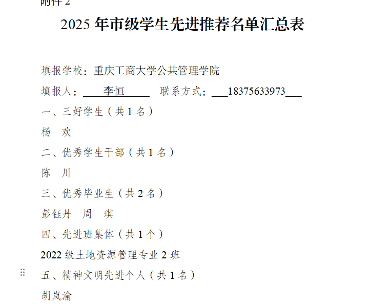 当前位置: 首页 >> 学团工作 >> 正文 122cc太阳集成游戏2025年重庆高校学生先进评选公示 时间:2025年04月07日 11:11 作者: 李恒 根据《太阳成集团tyc122cc关于开展2025年重庆市高校学生先进评选表扬活动的通知》要求,经学院学生工作领导小组评议审核,现对122cc太阳集成游戏2025年重庆高校学生先进评选情况进行公示,公示时间:2025.4.7——2025.4.8,如有异议请向学院学工办反馈意见(邮箱:liheng2@ctbu.edu.cn;电话18375633973)。 上一条:122cc太阳集成游戏举办“读懂中国:发展才是硬道理”主题讲座 下一条:122cc太阳集成游戏开展考研复试指导交流会--土地、地理类专场 【关闭】