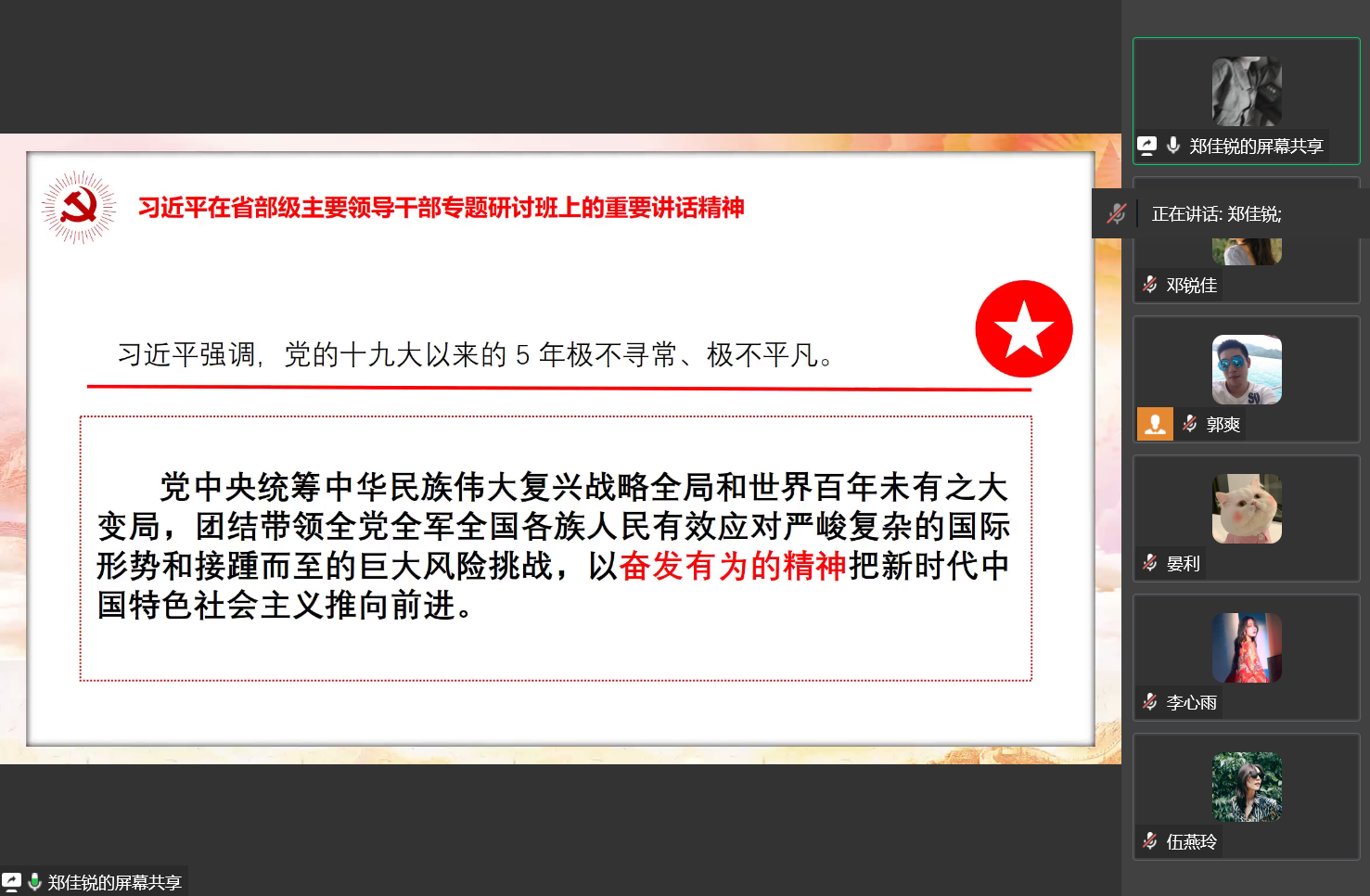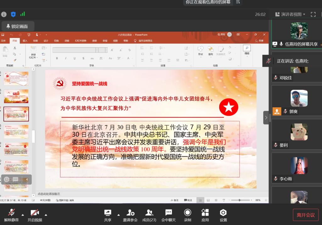 当前位置: 首页 >> 党建双创 >> 主题党日活动 >> 正文 122cc太阳集成游戏学生第一党支部召开8月份主题党日活动 时间:2022年08月19日 16:40 作者: 郭爽 2022年8月19日,122cc太阳集成游戏学生第一党支部在线上企业微信召开月8主题党日活动,本次活动应到23人,实到23人,本次活动由支部书记郭爽主持。 会议伊始,首先是由2020级郑佳锐、罗阳、伍燕玲、邓锐佳四位党员同志领学8月相关学习内容。其中郑佳锐同志领学了关于《习近平在新疆考察时的重要讲话精神》、《习近平向世界青年发展论坛致贺信》、《习近平在省部级主要领导干部专题研讨班上的重要讲话精神》的内容,她指出各国青年要弘扬和平、发展、公平、正义、民主、自由的全人类共同价值,以实际行动推进全球发展倡议,助力落实联合国2030年可持续发展议程,共同谱写世界青年团结合作的时代新篇章。罗阳同志领学了关于《习近平主持中共中央政治局7月28日会议》、《习近平在党外人士座谈会上的重要讲话精神》、《习近平向中国共产党与世界马克思主义政党论坛致贺信》的内容,她指出只要贯彻落实好中共中央决策部署,准确识变、科学应变、主动求变,就一定能够抓住历史机遇、赢得发展先机。伍燕玲同志领学了关于《习近平在中央统战工作会议上的重要讲话精神》、《习近平总书记重要文章《把中国文明历史研究引向深入, 增强历史自觉坚定文化自信》》、《习近平总书记重要文章《在庆祝中国人民解放军建军90周年大会上的讲话》》的内容,她指出我们要坚持以新时代中国特色社会主义思想为指导,坚持中国共产党领导,坚持中国特色社会主义道路,高举爱国主义、社会主义伟大旗帜,坚持一致性和多样性统一。邓锐佳同志领学了关于《《习近平生态文明思想学习纲要》出版发行》、《中共中央办公厅转发《中央宣传部、中央组织部关于认真组织学习〈习近平谈治国理政〉第四卷的通知》》、《市委常委会7月19日会议精神(部署学习宣传贯彻《习近平谈治国理政》第四卷等工作)》、《《习近平谈治国理政》第一卷至第三卷(电子版)》的内容,她指出我们深切缅怀为中国人民解放事业和社会主义建设事业而英勇献身的人民军队革命烈士们,他们的牺牲奉献,永远铭记在中国人民心中。领学完毕后,与会党员同志展开了讨论。杨若欣同志说:“作为新时代新青年,应做到全面系统学、及时跟进学、深入思考学、联系实际学,坚持不懈用习近平新时代中国特色社会主义思想武装头脑、指导实践、推动工作,自觉做习近平生态文明思想的坚定信仰者和忠实践行者。”李心雨同志说:“青年代表希望,青年创造明天。中国始终把青年看作推动社会发展的有生力量,我们也要不负祖国的期望,为祖国的建设添砖加瓦。” 讨论后,支部书记郭爽同志作了总结讲话。他提醒党员同志们要加强疫情防范意识,做好防护工作。开学在即,希望各位党员同志能够做好表率,同时积极引导班级其他同学,有序返校。同时,他对党员同志提出殷切希望,希望各位党员同志能够把握住机会,针对自己的实际情况,做出切实的人生规划并为之努力奋斗。 上一条:122cc太阳集成游戏学生第一党支部召开2022年9月主题党日活动 下一条:122cc太阳集成游戏学生第一党支部召开2022年7月主题党日活动 【关闭】