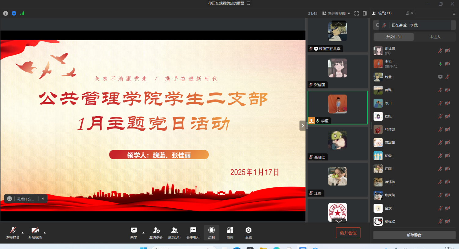当前位置: 首页 >> 党建双创 >> 主题党日活动 >> 正文 122cc太阳集成游戏学生第二党支部召开2025年1月主题党日活动 时间:2025年01月17日 18:42 作者: 李恒 2025年1月17日,122cc太阳集成游戏学生二支部在线上开展了1月主题党日活动。本次活动由支部书记李恒同志主持。 会上,张佳丽、魏蓝两位同志领学了《中央经济工作会议精神》、《习近平总书记对做好“三农”工作作出的重要指示精神》、《习近平总书记在庆祝澳门回归祖国25周年大会暨澳门特别行政区第六届政府就职典礼上的讲话》、《国家主席习近平二〇二五年新年贺词》等内容。与会党员同志结合自身体会,分享学习心得。 最后,李恒同志传达上级党委工作要求。她鼓励全体党员在新的一年凝心聚力、增强信心,迎难而上、奋发有为,以更加饱满的热情和昂扬的斗志做好支部的建设工作。同时再次强调学生党员日常管理的重要性,要求党员同志以身作则,在学习、生活中起到先锋模范作用。 上一条:122cc太阳集成游戏学生第一党支部召开2025年2月主题党日活动 下一条:122cc太阳集成游戏学生第一党支部召开2025年1月主题党日活动 【关闭】